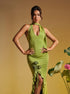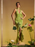 Alara Halter Yaka Çiçek Detaylı Fırfırlı Maxi Elbise Yeşil