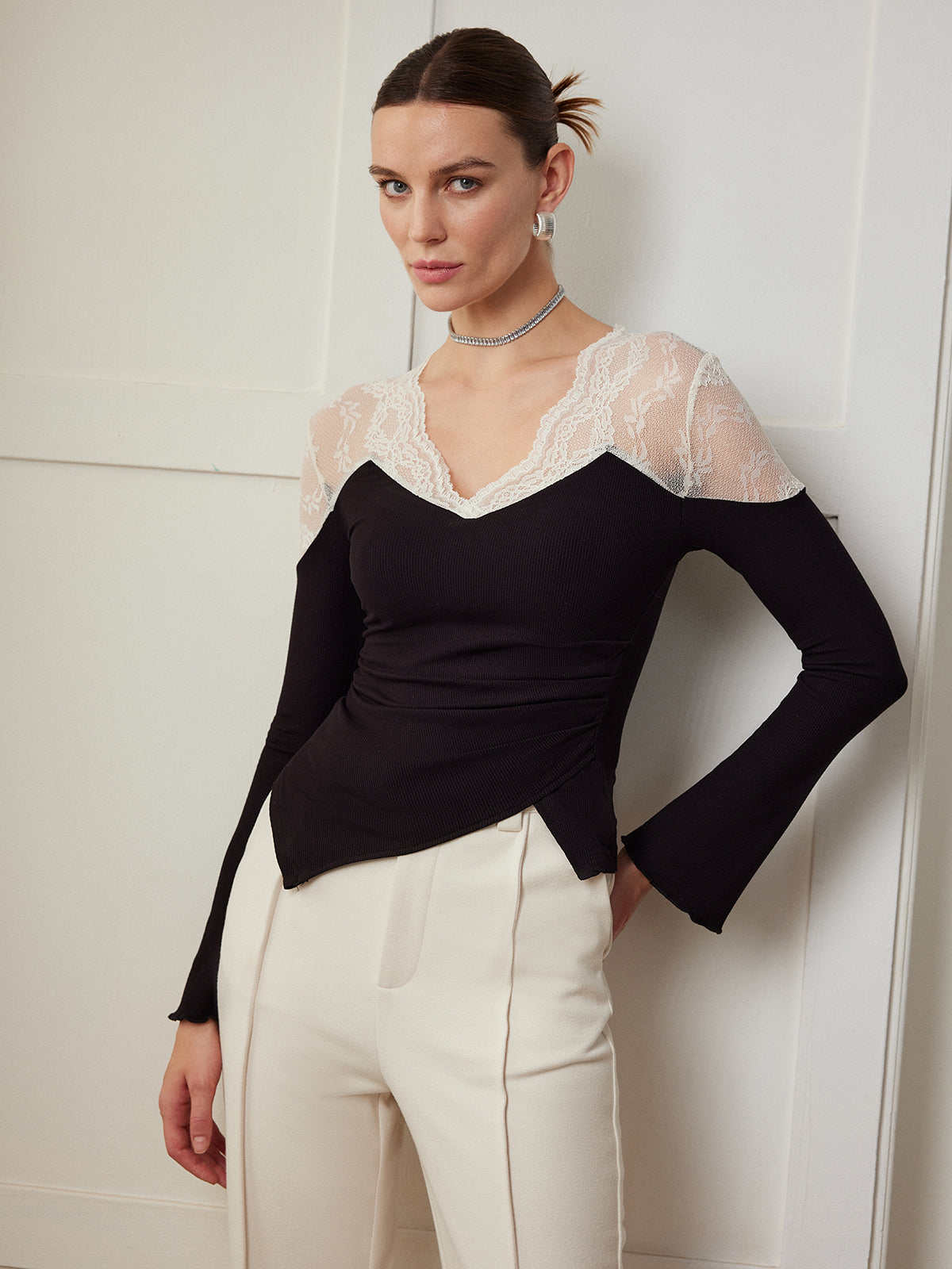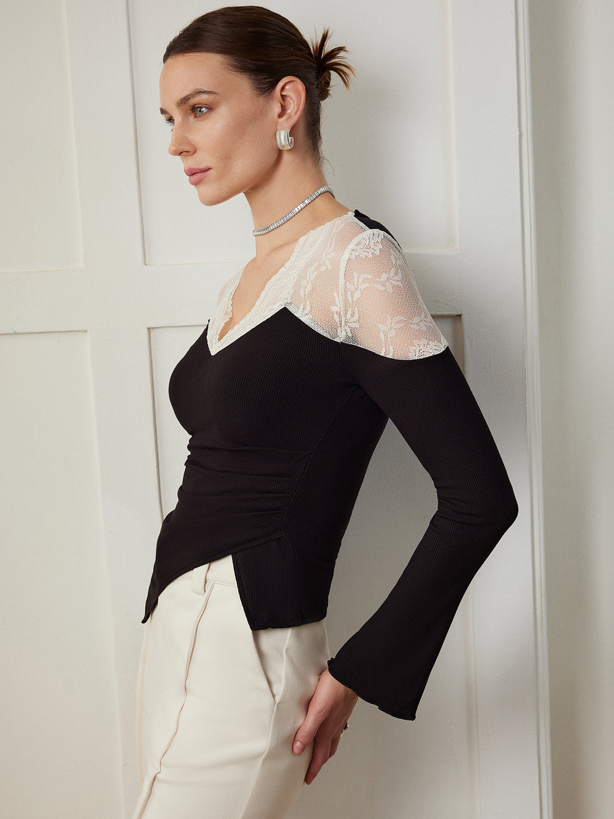 Zarif Dantel Panelli Şık Asimetrik Dar Bluz