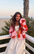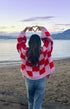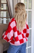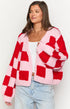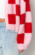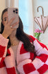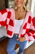 Pembe ve Kırmızı Kare Desenli Kalın Triko Hırka