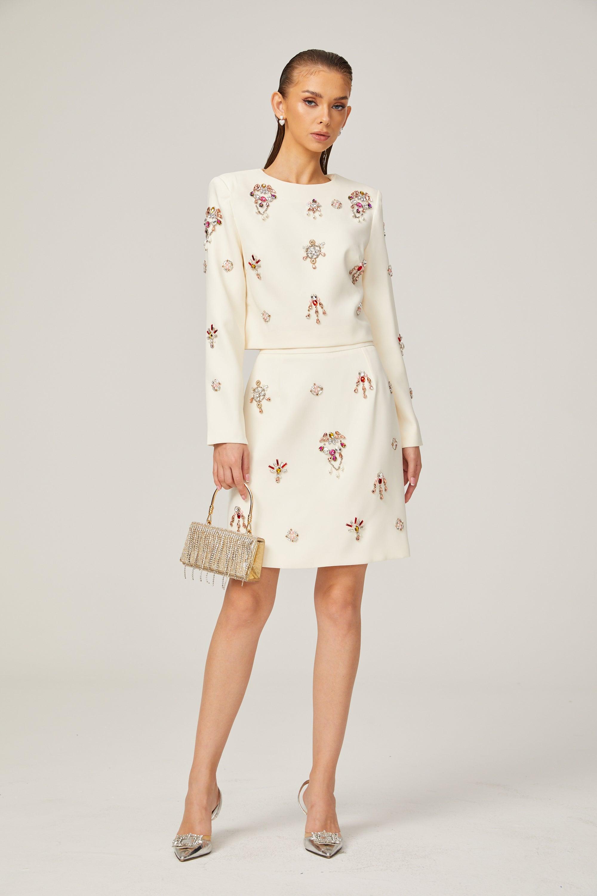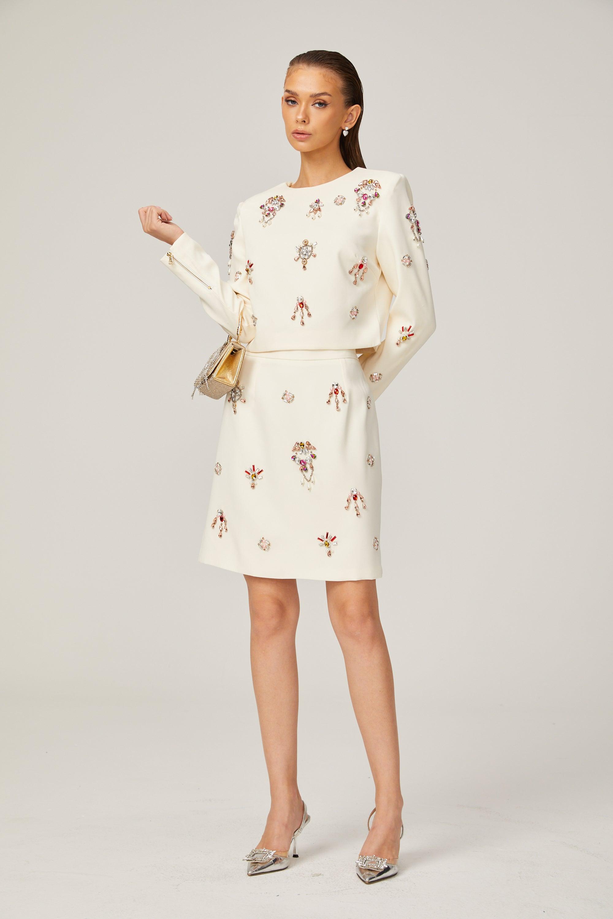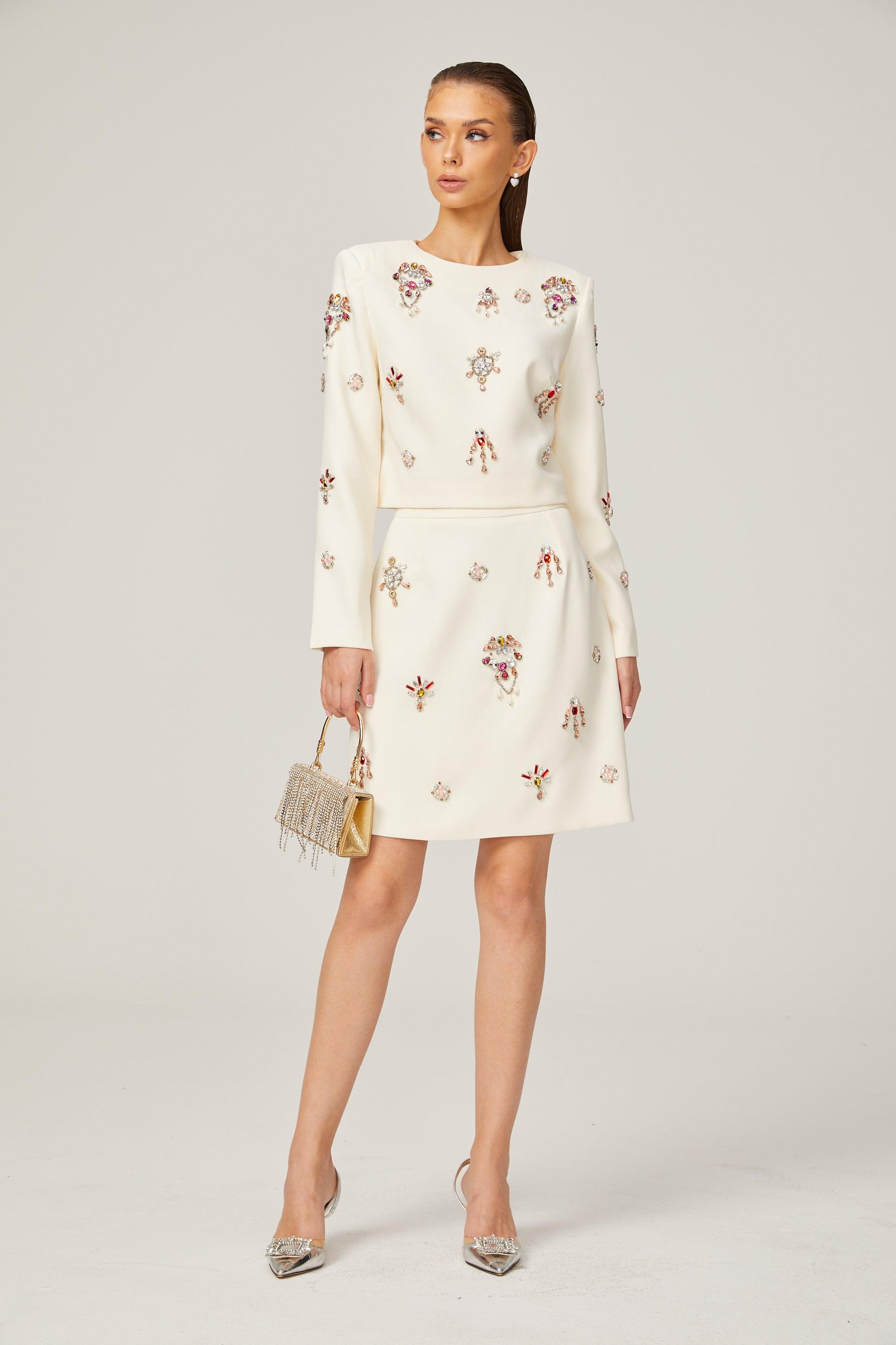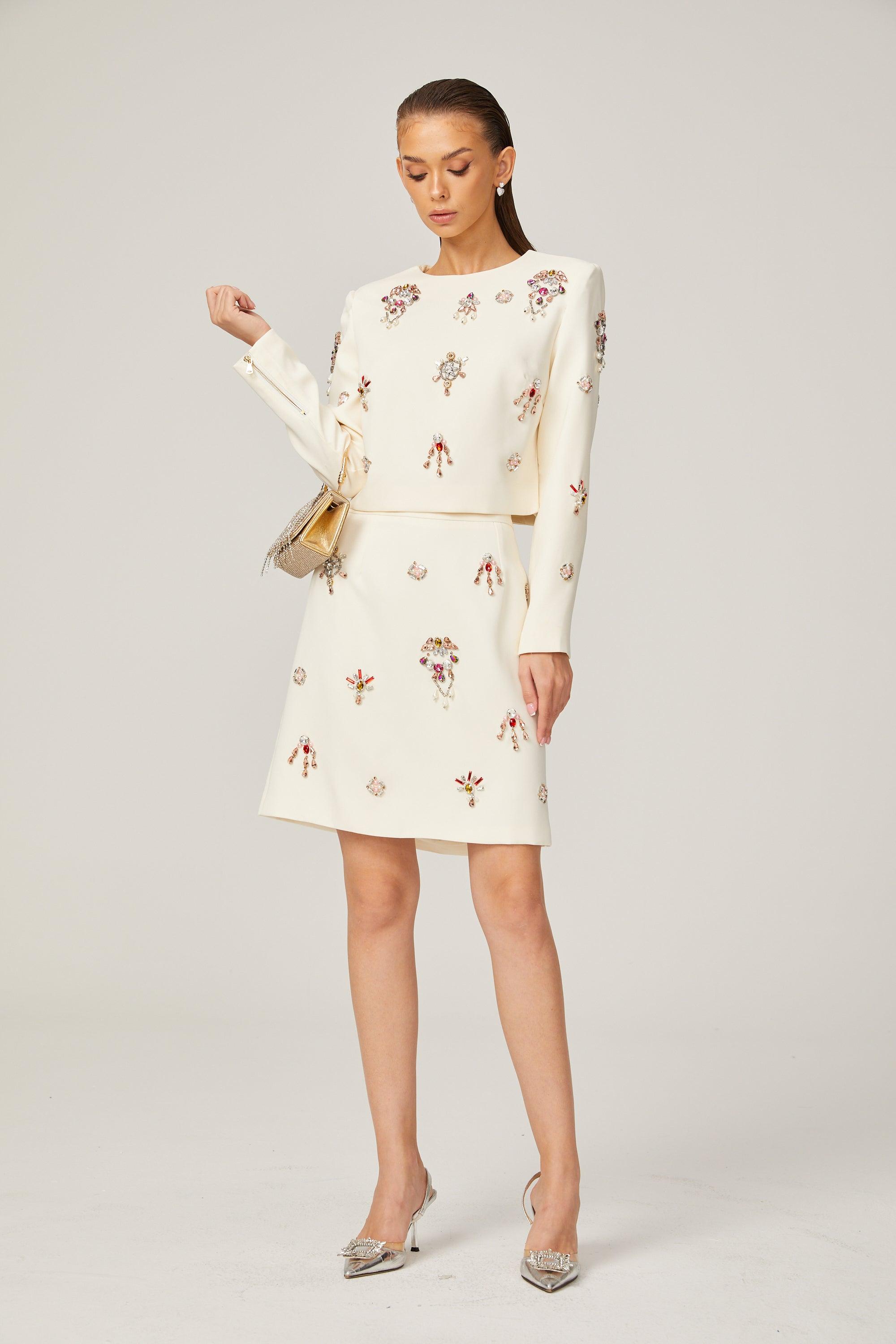 Kraliyet Işıltısı Taş İşlemeli Krem Elbise Seti