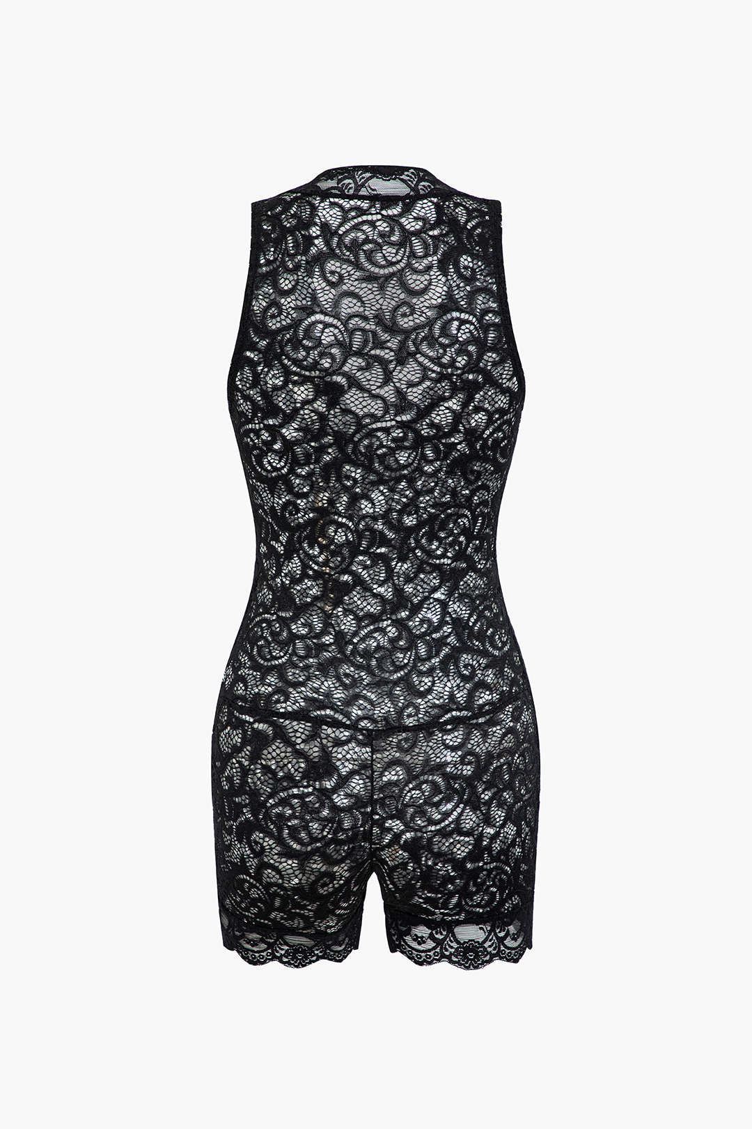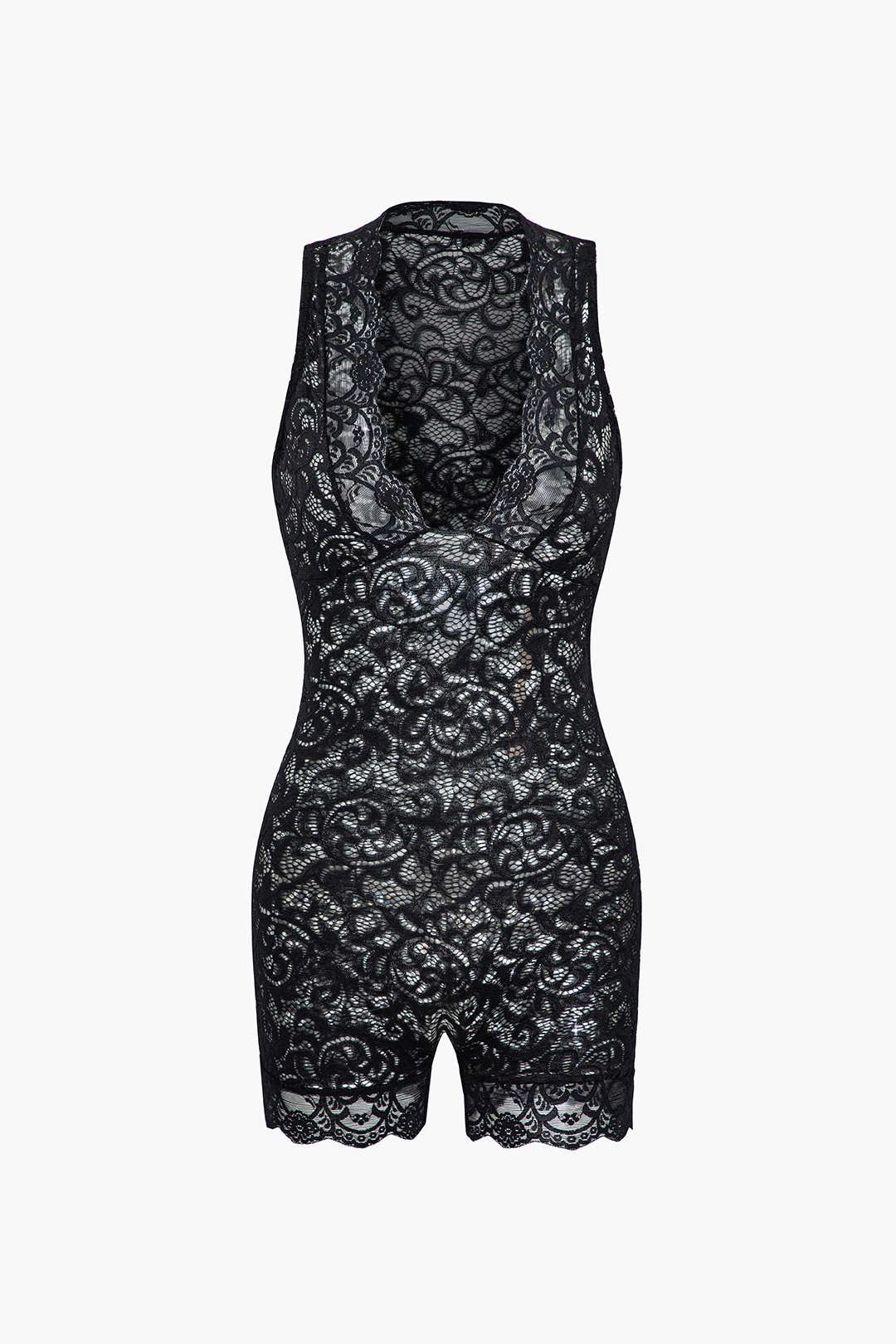 Dantel Şeffaf V Yaka Kolsuz Tulum
