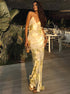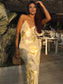 Metalik Baskılı V Yaka Sırtı Açık Slip Uzun Elbise