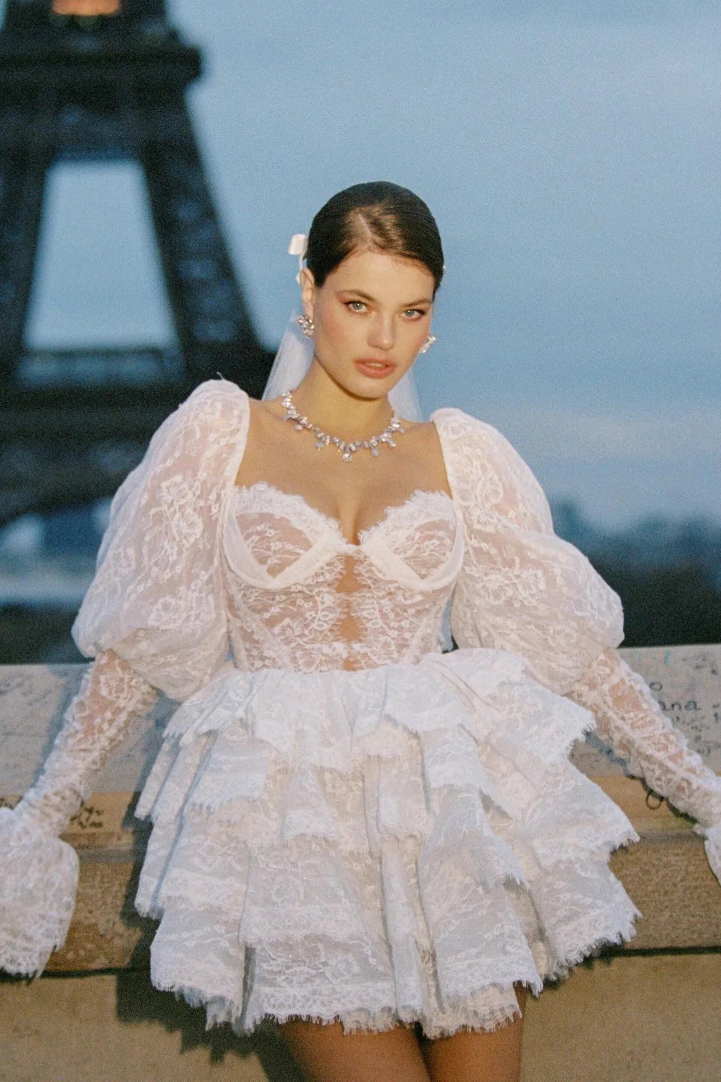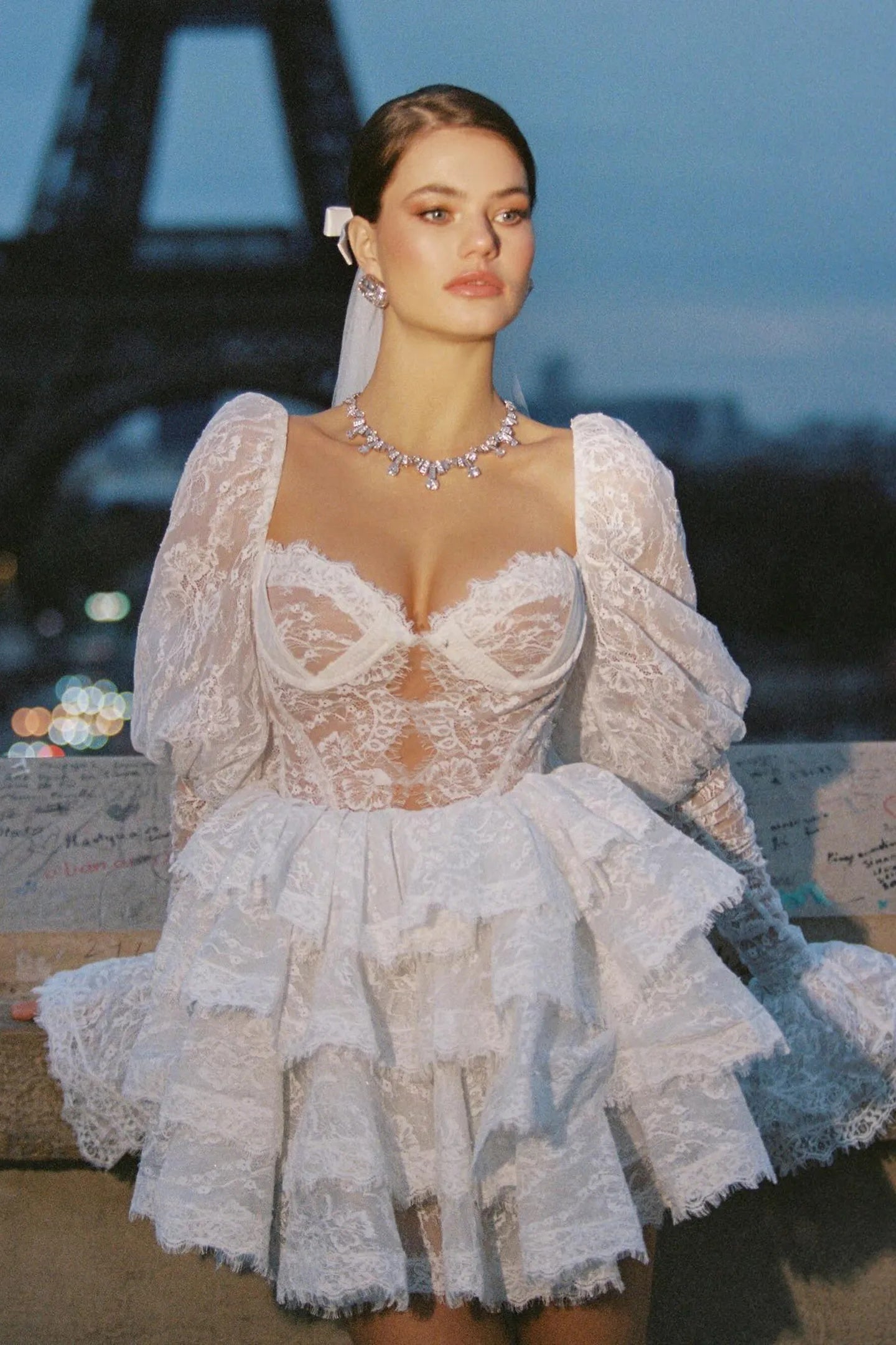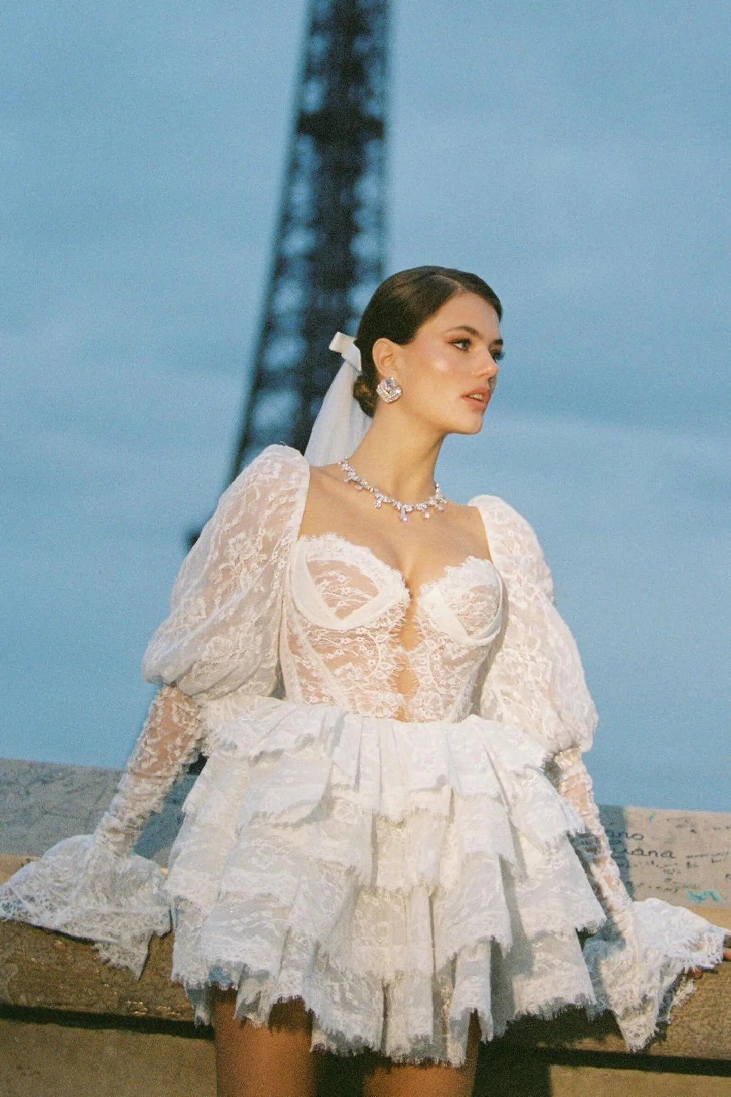 Olyssa Bonnie Dantel Puf Kollu Mini Elbise