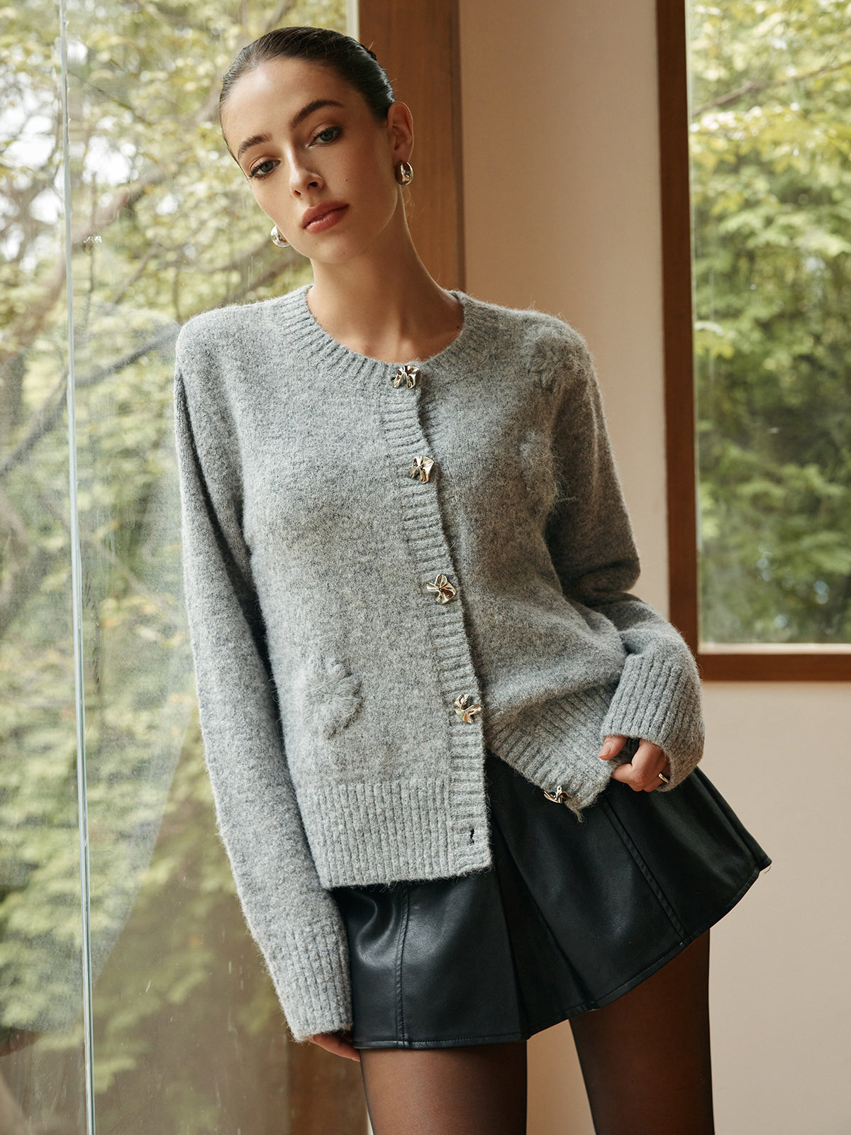Örgü Çiçekli Metal Düğmeli Hırka