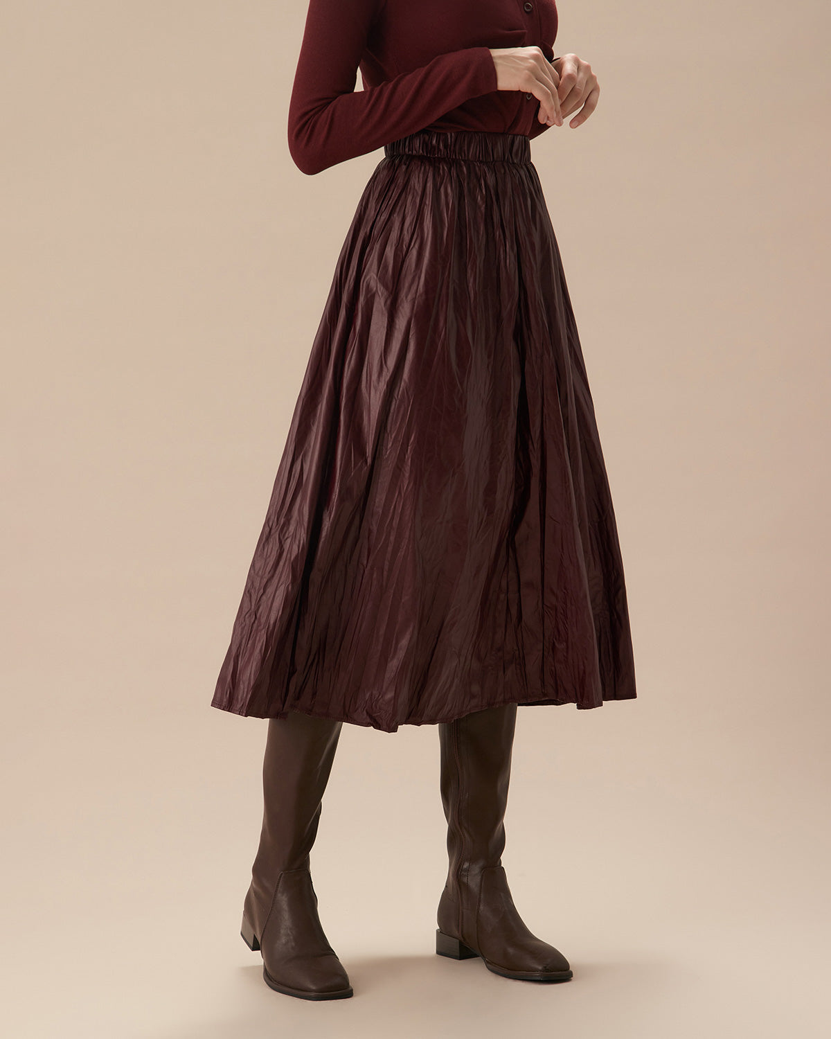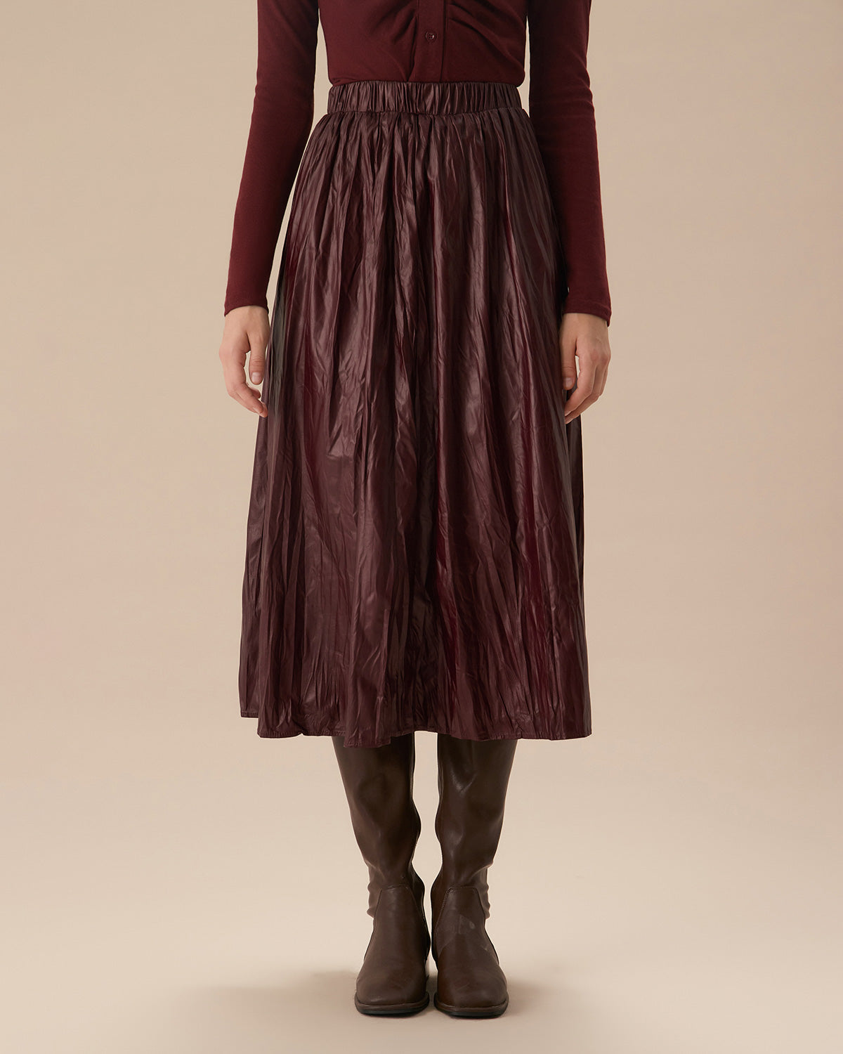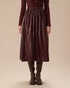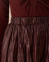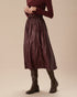 Şarap Kırmızısı Deri Görünümlü Lastikli Bel Büzgülü Midi Etek
