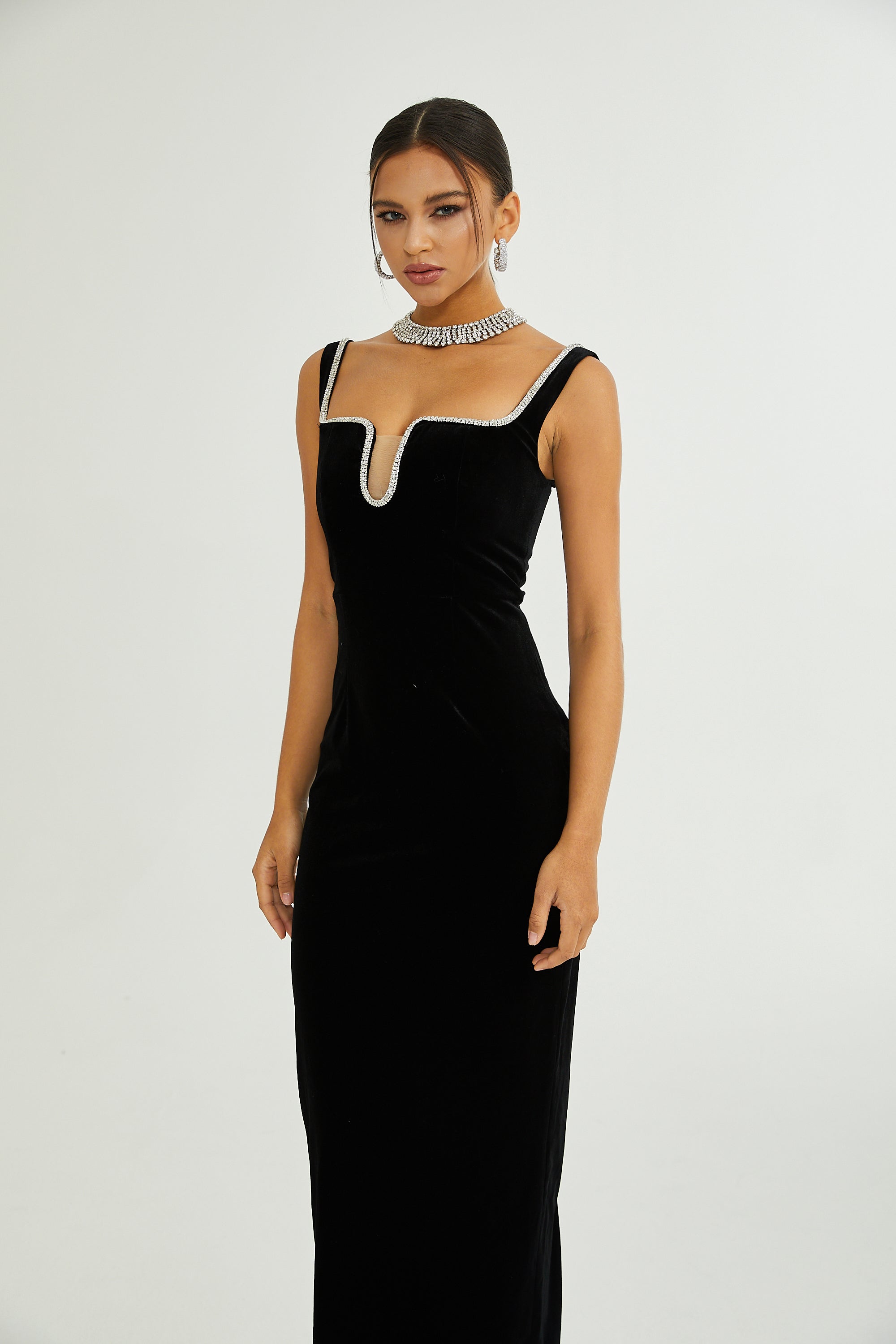 Olyssa Blanche Siyah U Yaka Midi Elbise