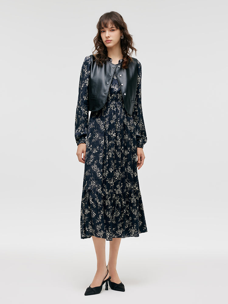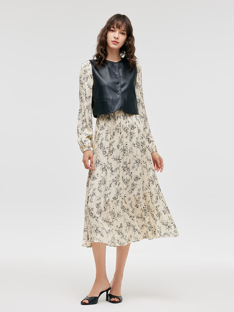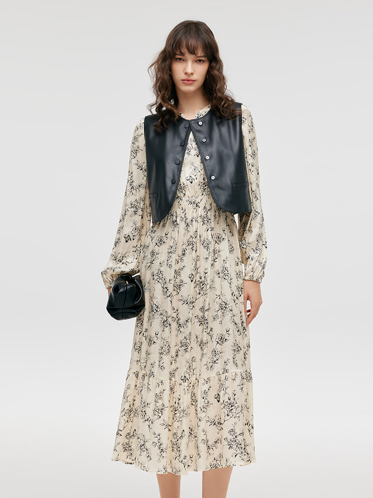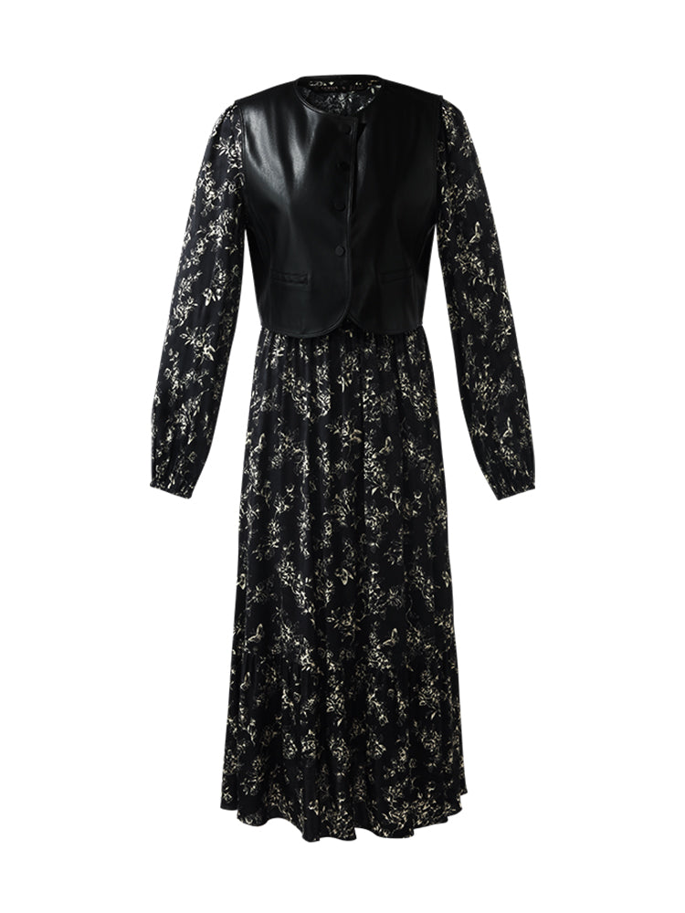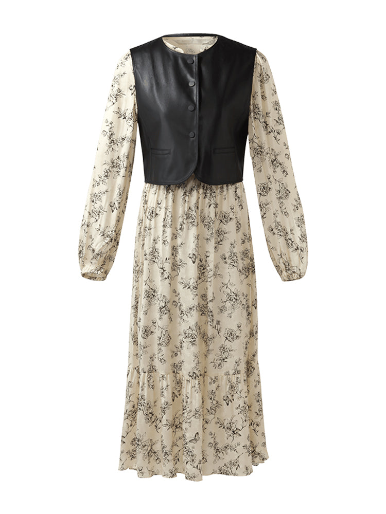 Çevre Dostu Kürk Yelek ve Çiçek Desenli Elbise İkili Takım