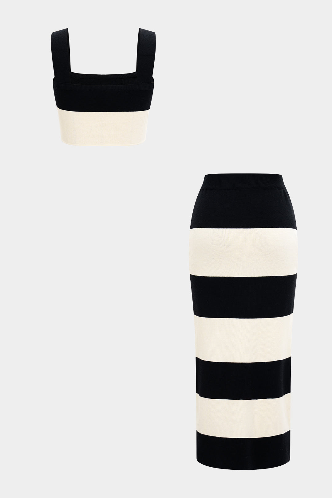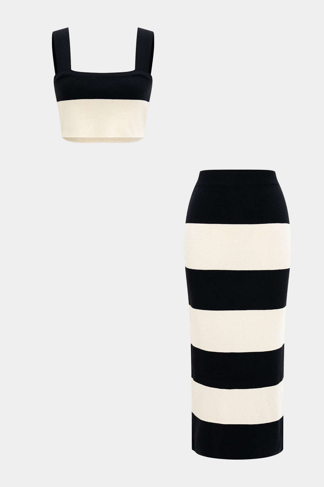 Örgü Kontrast Askılı Üst ve Etek Takımı