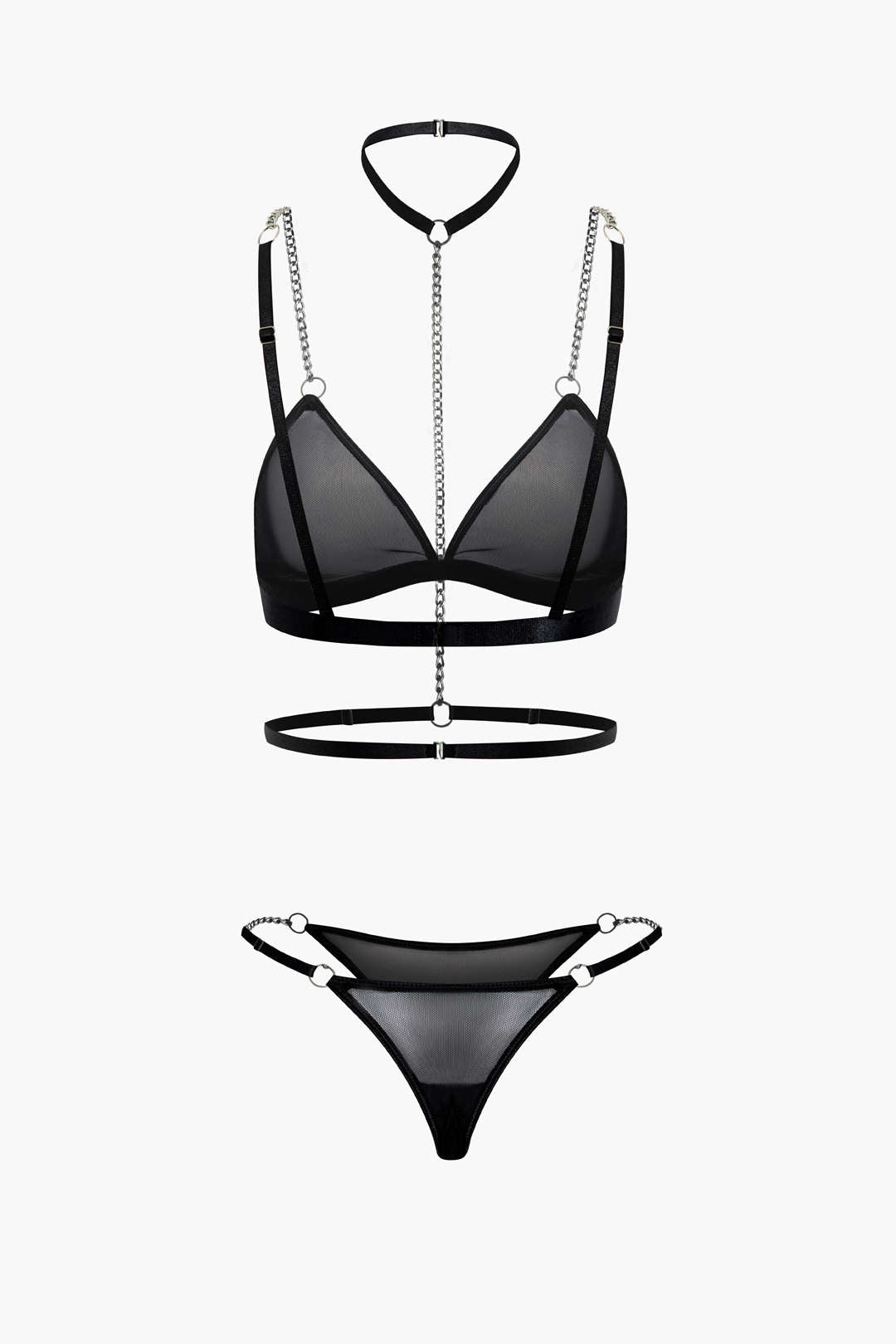 File Şeffaf Zincir Detaylı İki Parçalı İç Giyim Seti ve Choker