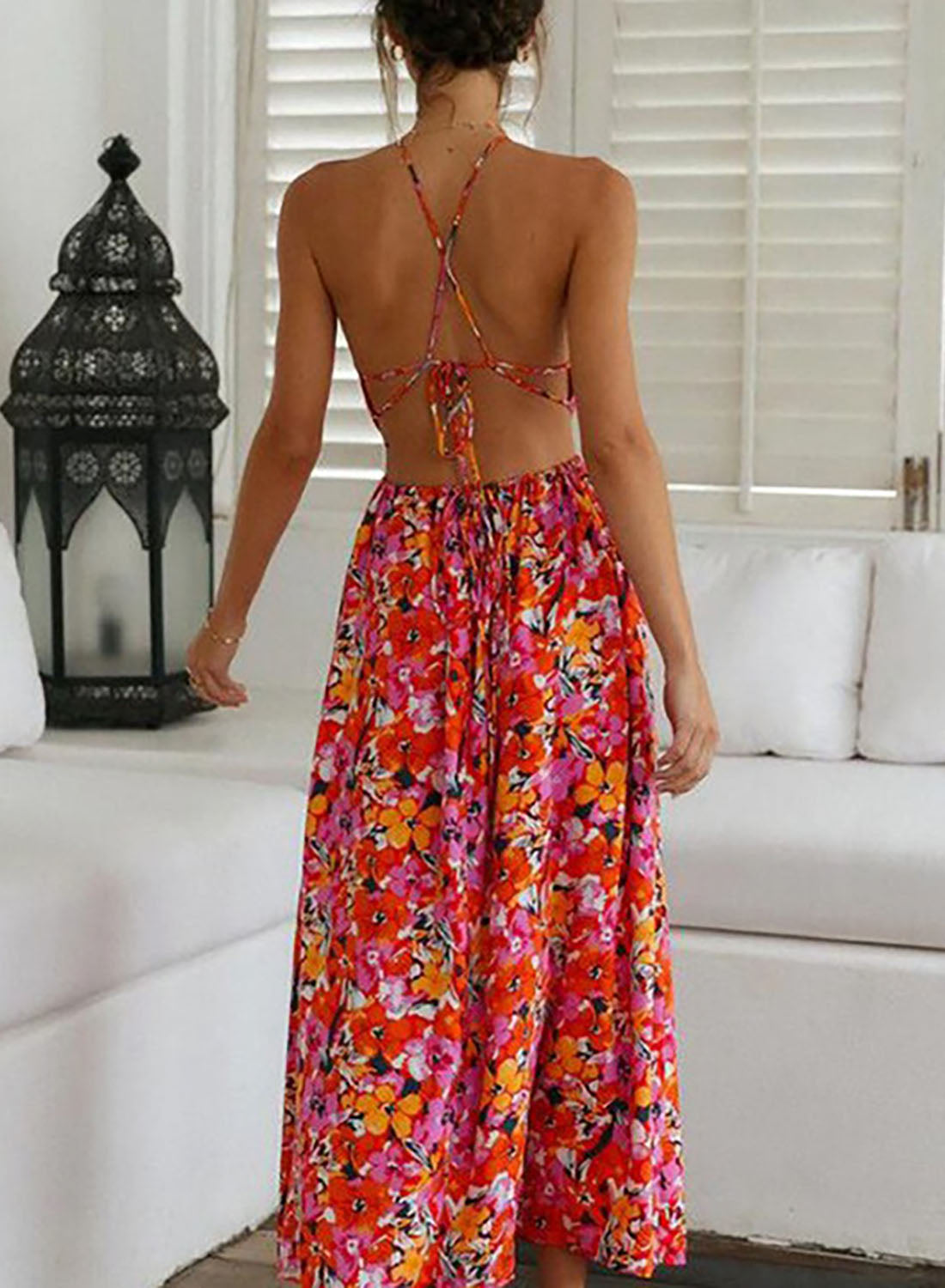 Olyssa Çiçekli Sırt Dekolteli Maksi Elbise